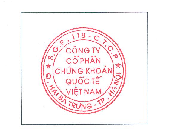 Căn cứ Giấy chứng nhận đã đăng ký mẫu dấu số 1388/14/ĐKMD ngày 17/09/2014 do Công An Cục Cảnh sát quản lý Hành chính về Trật tự xã hội đã chứng nhận mẫu dấu mới của Công ty cổ phần Chứng khoán Quốc tế Việt Nam đã đăng ký và được phép sử dụng từ ngày 22/09/2014, kể từ ngày 22/09/2014, Công ty cổ phần Chứng khoán Quốc tế Việt Nam chính thức sử dụng con dấu mới theo mẫu dưới đây: